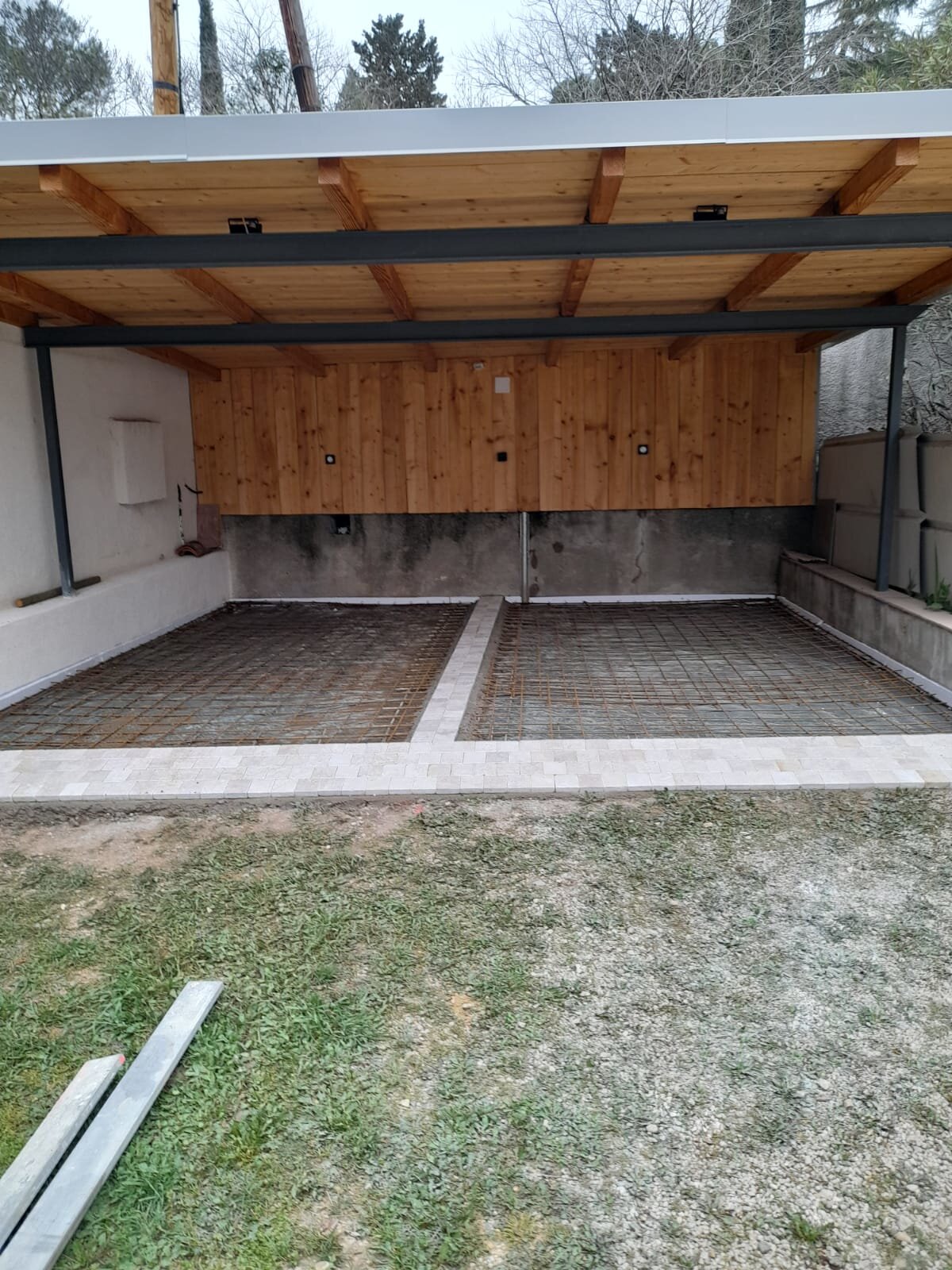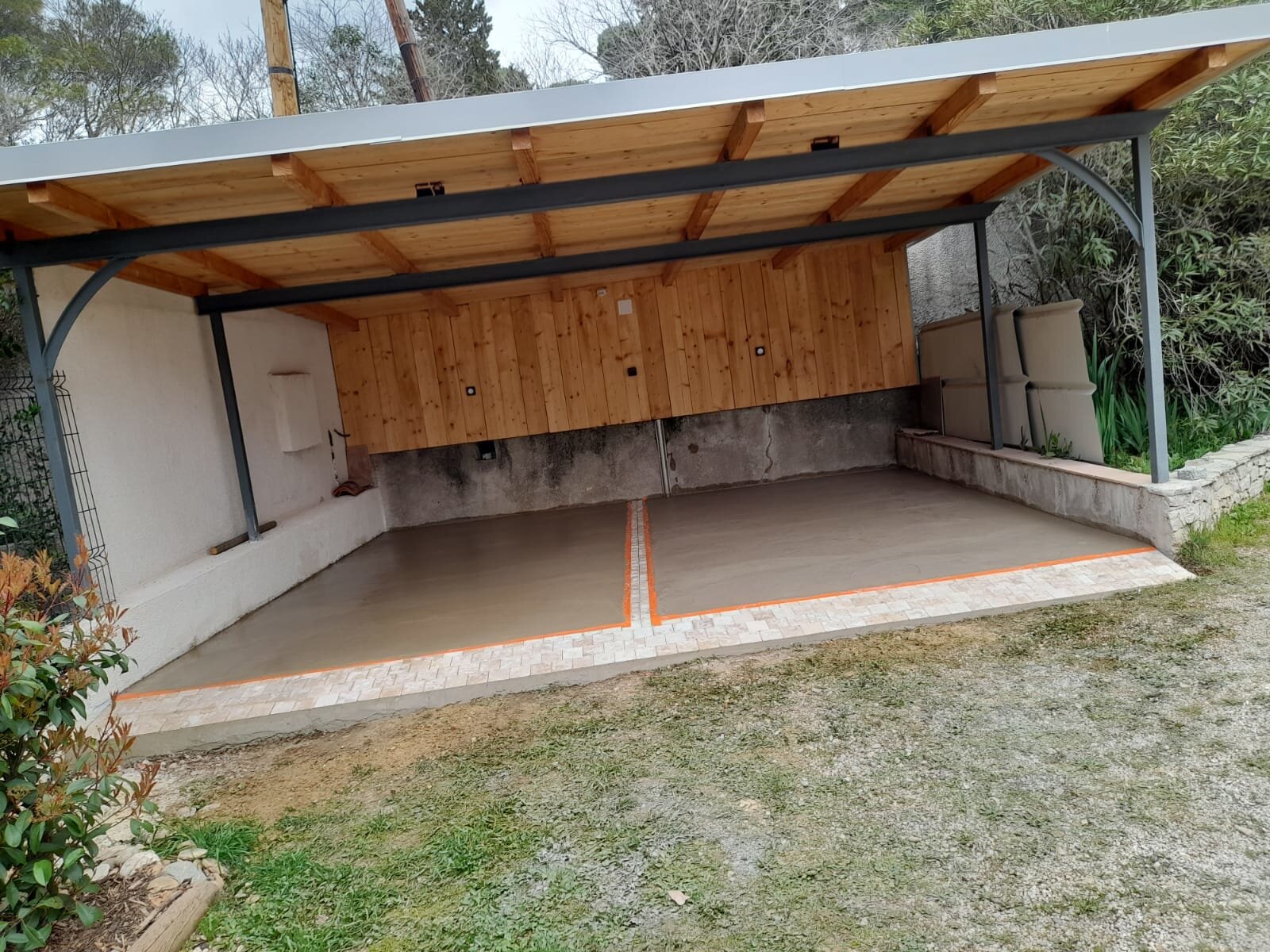 Coulage de dalle en béton, avec de bande décoratifs en pavé autobloquant